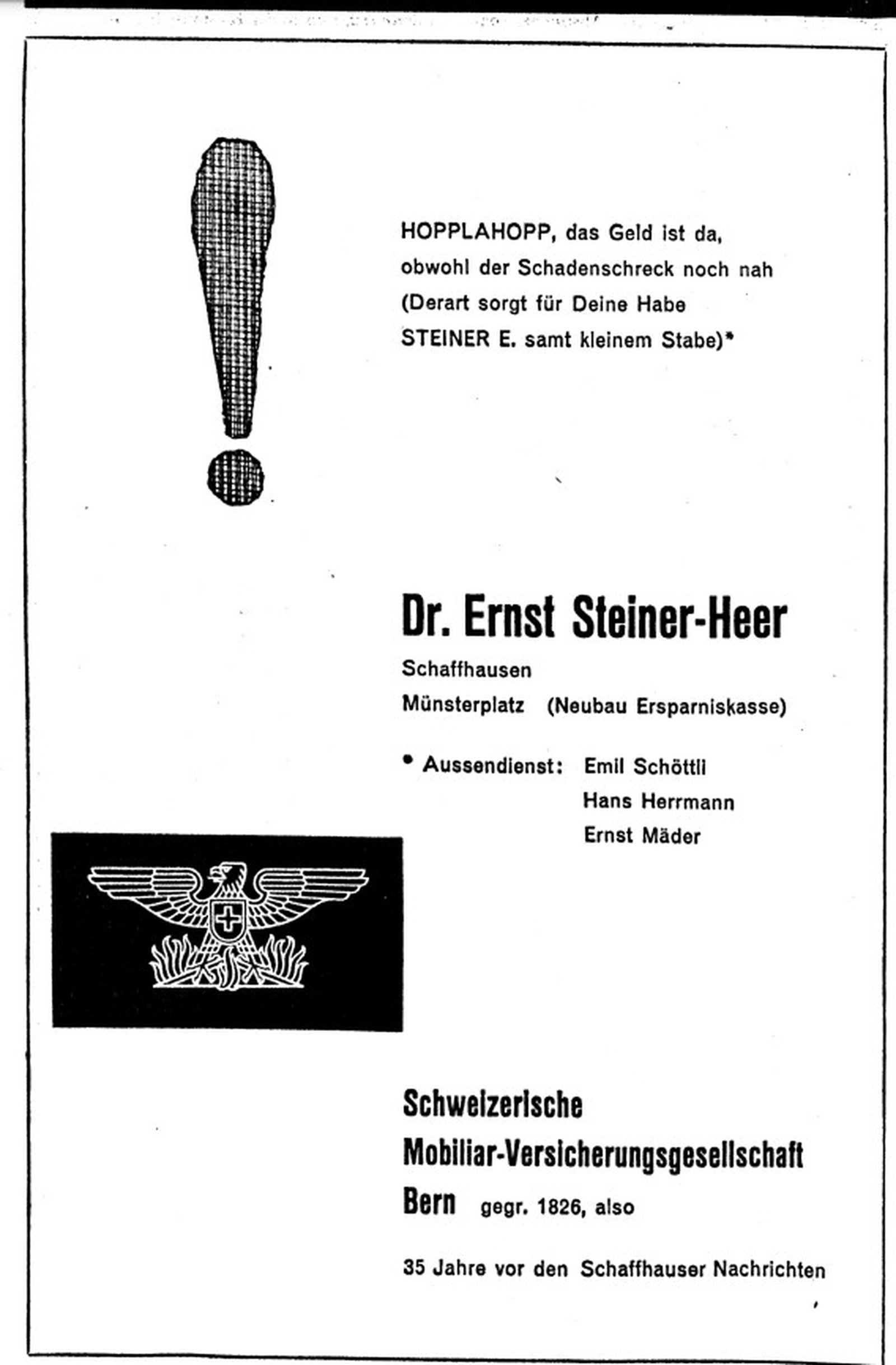Dopo dieci anni come agente generale, nel 1968 Ernst Steiner-Heer assume una nuova sfida: prima come direttore e poi come presidente del consiglio di amministrazione dei Portland-Zementwerke di Thayngen. Nel 1979 viene inoltre eletto Consigliere agli Stati per il Cantone di Sciaffusa. Gli succede Emil Schöttli, fino ad allora suo vice. Dopo l’apprendistato alla Mobiliare, aveva lavorato otto anni presso l’agenzia generale di Ginevra, dove era considerato «un des meilleurs acquisiteurs».