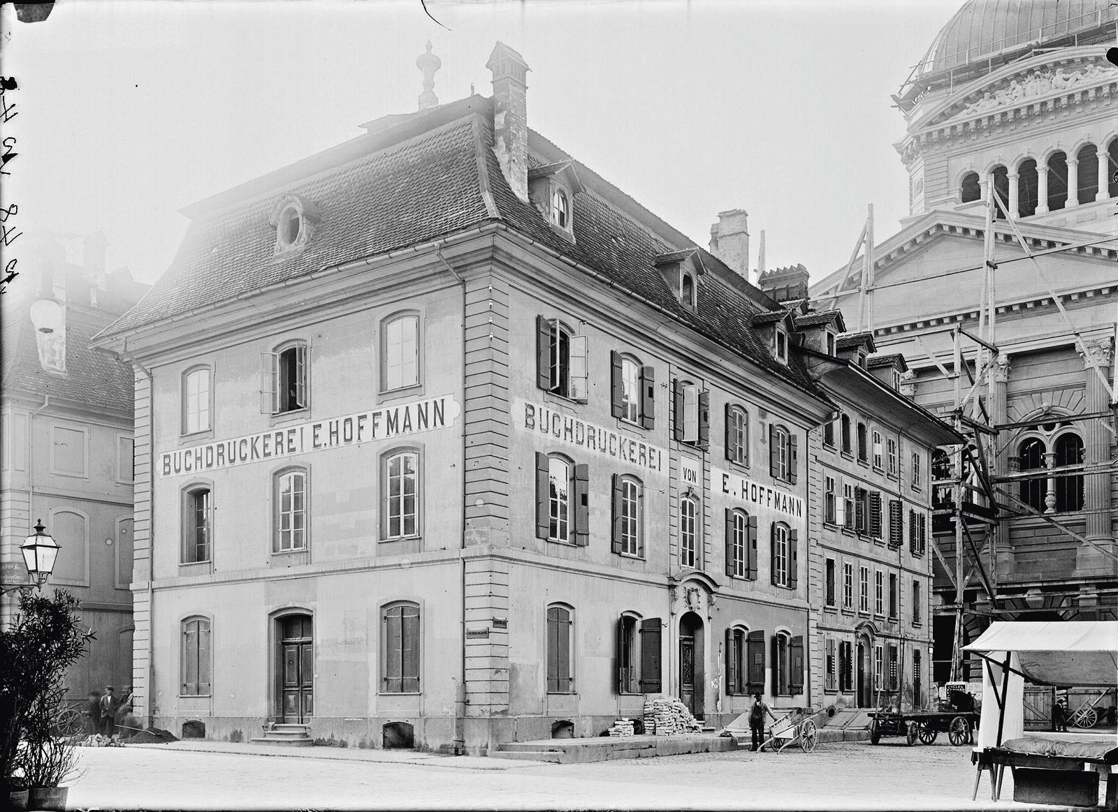 Amthausgasse. Sulla sinistra è ancora visibile l’ex edificio della Direzione – sede demolita nel 1900 per fare spazio alla Bundesplatz – e più indietro si scorge il Palazzo federale quasi terminato.