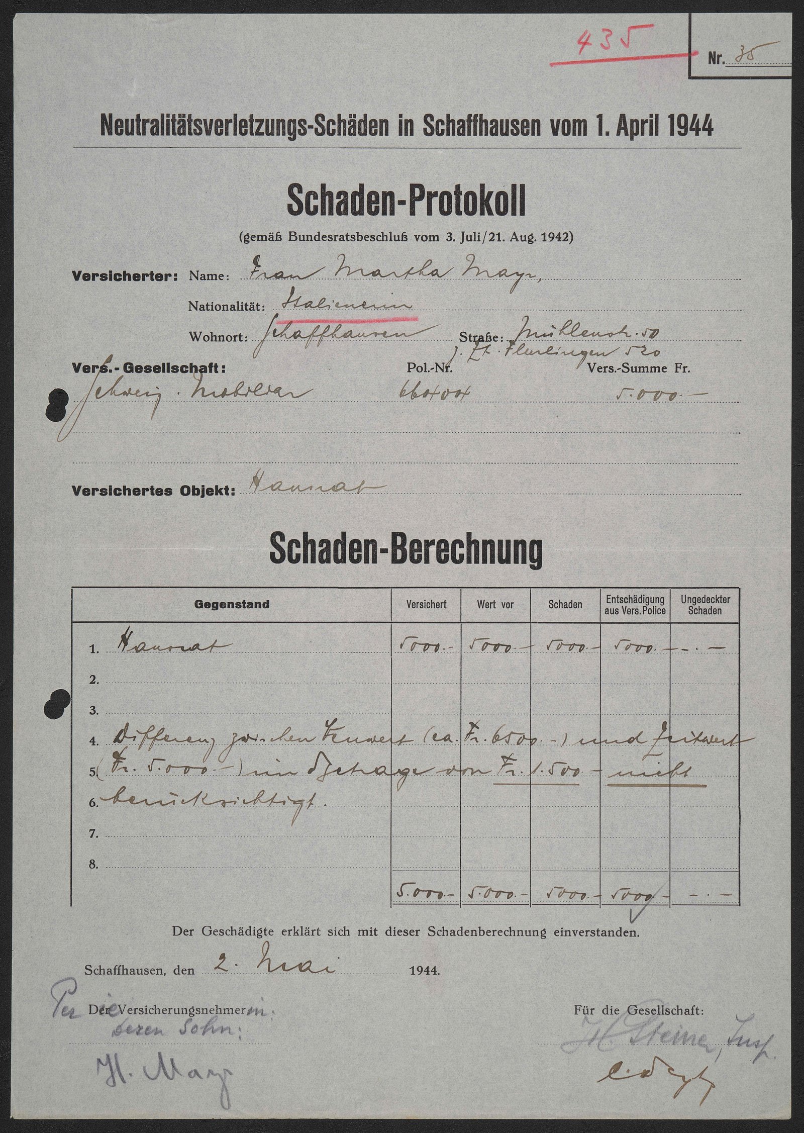 L’episodio più grave interessa Sciaffusa: il 1º aprile 1944, 40 persone muoiono a causa delle bombe sganciate dai velivoli statunitensi, e molte altre rimangono ferite. 66 stabili vengono in parte o del tutto distrutti. Con un decreto, il Consiglio federale stabilisce che tutte le assicurazioni svizzere contro gli incendi sono tenute a contribuire a fondo perduto alla copertura dei danni causati da violazioni della neutralità. Nel caso di Sciaffusa, la Mobiliare deve così sborsare diversi milioni di franchi. In totale sono circa 500 gli assicurati della Mobiliare interessati.