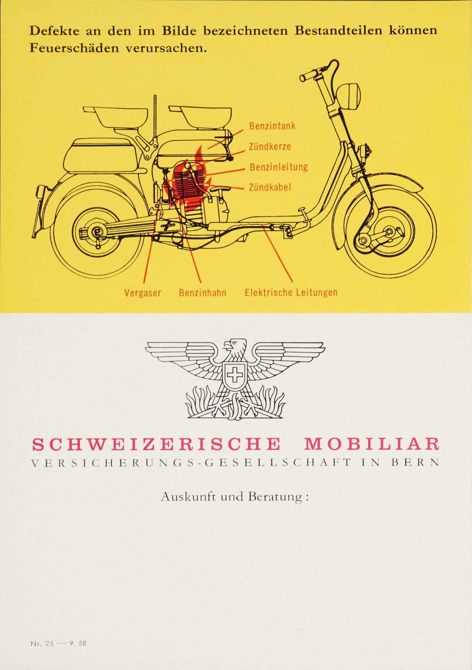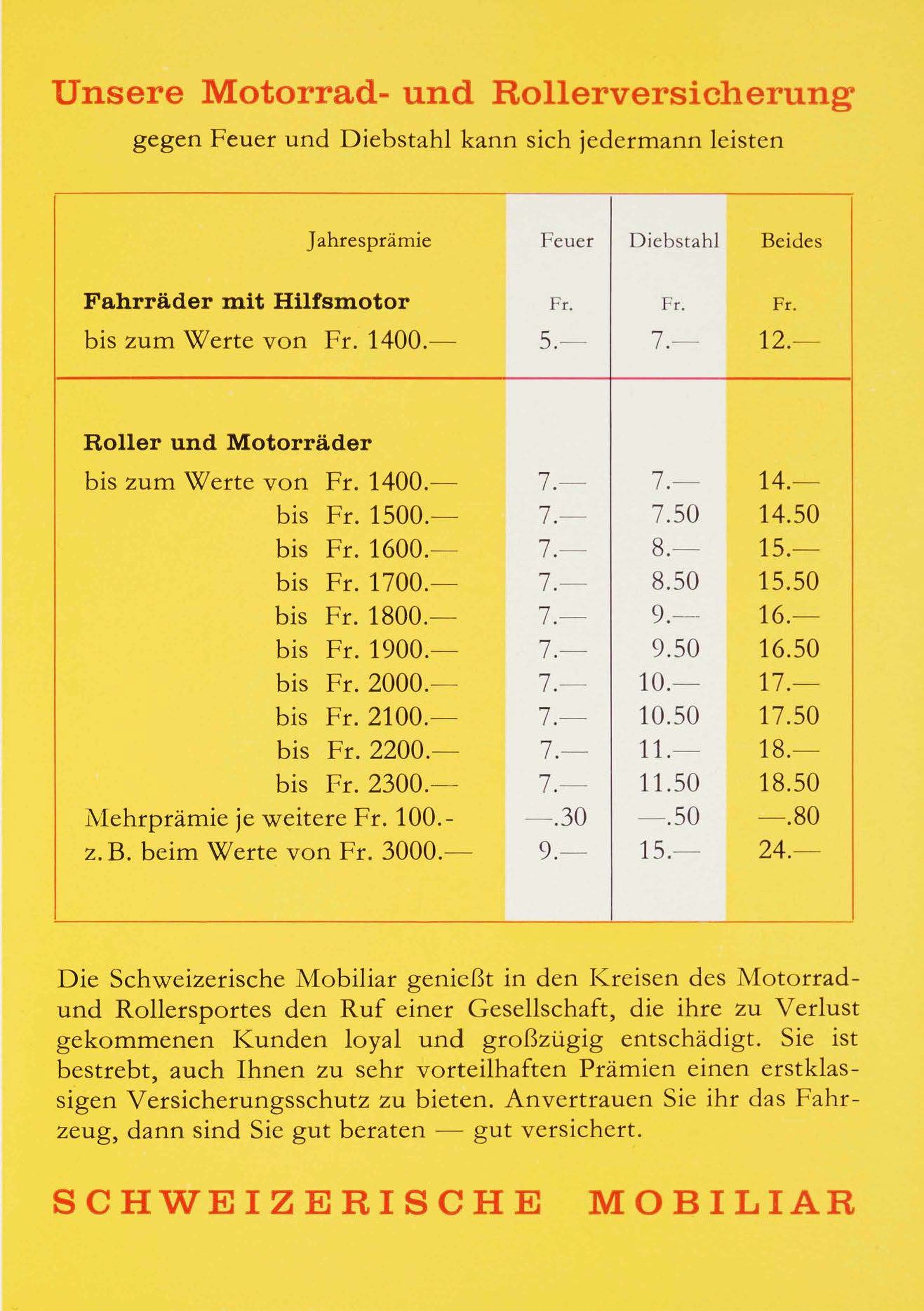 Negli anni Cinquanta la Svizzera vede un’invasione di scooter. La Mobiliare, in risposta, sviluppa prodotti assicurativi specifici e propone una pubblicità che esalta lo stile di vita spensierato offerto dalle due ruote.