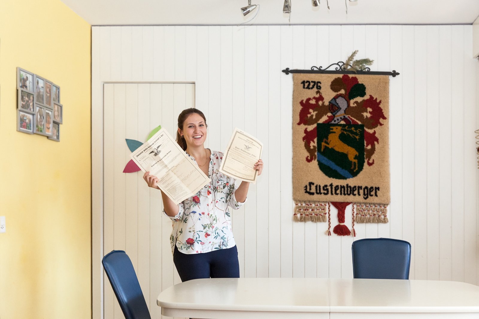 «È una N? La seconda parola è sicuramente operaio». La famiglia Lustenberger ritrova due vecchi contratti della Mobiliare del 1904 e del 1931. Sulla vecchia polizza compilata a mano Chiara Lustenberger cerca di decifrare la professione del bisnonno. Confronta le lettere e cerca di interpretare la scrittura. Il contratto più recente, compilato in modo leggibile con la macchina da scrivere, assicurava i beni del nonno.